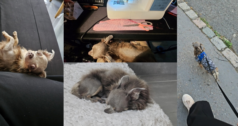 Je viens vous donner des nouvelles de Léon le petit chihuahua. Il s’est bien adapté à son environnement et est devenu la coqueluche de ma famille. Tout le monde l’adore ! En promenade il est sage et me suit, même avec les bruits de la ville. Il est propre et reconnaît son prénom. Il est très intelligent qu’il a très vite appris le assis, le coucher et la solitude. Je lui ai confectionné deux tee-shirts pour le protéger du soleil, le vétérinaire a dit que c’était une bonne idée par rapport à son alopécie et la crème solaire pour chien seulement s’il y a du soleil. En ville beaucoup de personnes le regardent et le trouvent adorable. Avec les petits chiens ça va mais avec les grands il reste sur la réserve et reste à côté de moi s’il n’est pas à l’aise. Il a pu rencontrer les chiennes de ma sœur (une petite croisé staffy et une bouledogue française) ça c’est bien passé mais il ne joue pas même avec la bouledogue. Ce n’est pas faute de faire des appels aux jeux. Mais au moins ça se passe bien. Niveau bêtises il ne m’en fait pas beaucoup. Juste mâchouiller le câble du chargeur de téléphone et de la pédale de la machine à coudre et une tentative de vol de trousse. Il a encore beaucoup à apprendre mais cela se fera avec le temps. Pour un petit chihuahua il est calme et adore venir avec moi sur le canapé voir même sur moi quand je couds. Je vous laisse des photos de la nouvelle vie de Léon.