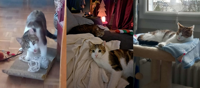 Mouche va très bien. Il adore les caresses et les calins, mais quand il le décide 🙂 Bon rapport avec Marvel, même s’il est un peu jaloux.