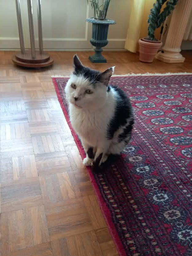 Les premiers jours, il était attendrissant car il me suivait partout en ronronnant. Aucun problème avec ses congénères. Très vite, il est venu dormir près de moi, toujours au même endroit, et il restait ainsi jusqu’au lever.