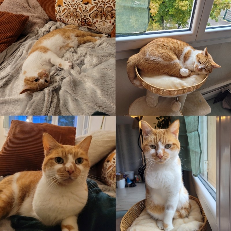 Il est encore un peu timide (surtout en journée) quand il y a du bruit qui résonne dans notre résidence, mais il commence doucement à se détendre et à faire sa vie dans notre appartement 🙂